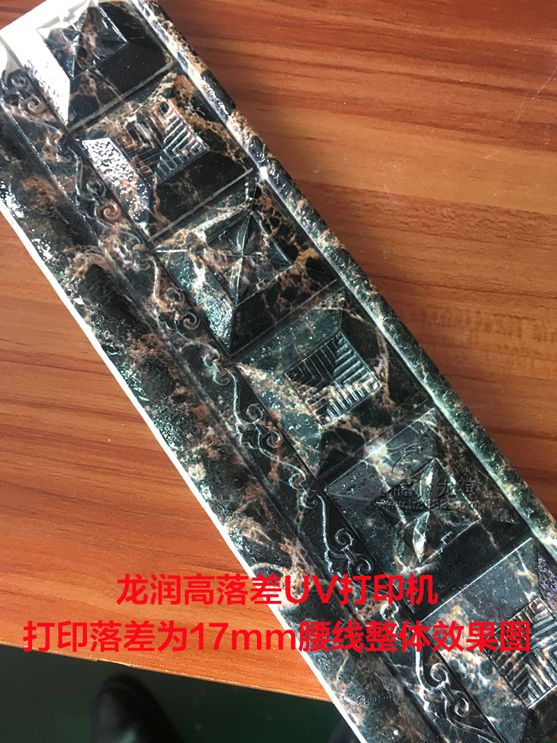 我們隨機抽取了一塊樣品進行打印,打印出來后整體效果還算滿意,客戶也能認可,然而我們那尺子測量該腰線的落差高度,才知道該腰線落差高度已經達到了17mm,比我們之前測試的15mm樣品還要高2mm,然而看細節(jié),發(fā)虛并不嚴重,也沒有嚴重飛墨的情況出現,整體效果已經是能達到客戶的需求。